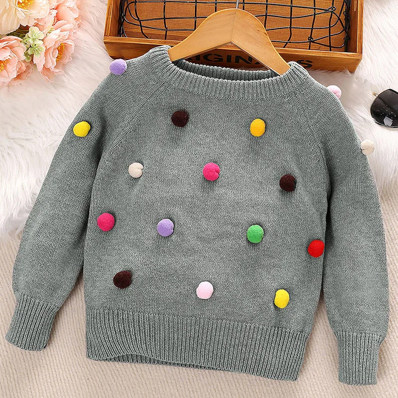 Girls Winter Grey Sweatshirt Cute Peter Pan Collar Openings at Cuffs with Colorful Poms Casual And Pretty Sweatshirt for Kids
